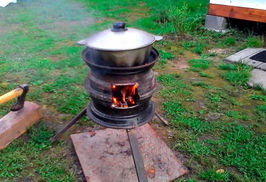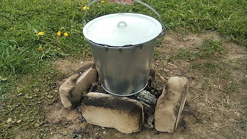Выше над ними привинчиваются ещё два уголка для установки решетки для мяса. Если надо подвесить продукт на крючках, на самом верху кастрюли монтируется на диаметре металлическая перекладина, на которую можно цеплять крючки. В качестве огня для разогрева можно использовать любой, подходящий источник.