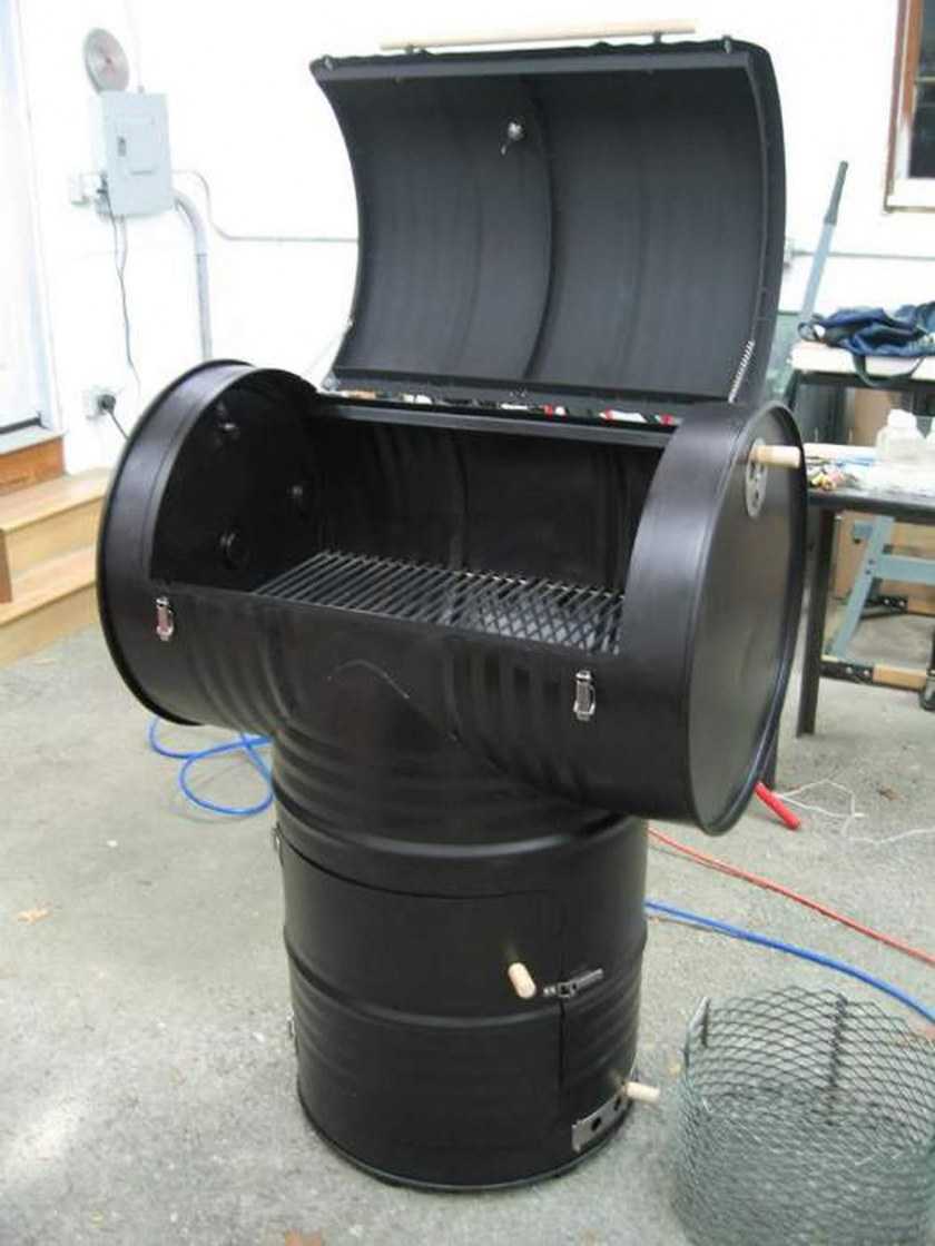 Аналогичным образом можно использовать вместо корпуса холодильника металлическую бочку. Правда, для переоборудования её в полноценную коптильню придётся приложить больше сил. Так, внутри потребуется поместить перекладины с крючками для подвешивания коптимых продуктов. Сверху сделать отверстие, плотно закрываемое крышкой. Подвод дыма осуществляется через нижнюю часть, а дымоотведение сквозь мелкие отверстия в крышке, или вставленную в неё трубу.