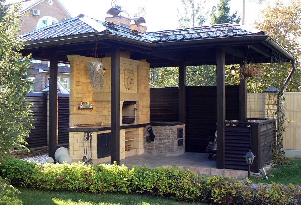 Закрытый тип предполагает установку мангала и обеденного стола с местами для сидения под единой кровлей на опорах.