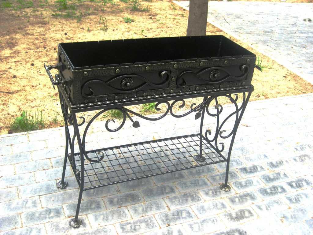 Металлический мангал можно оснастить подставками, небольшой столешницей для большего удобства