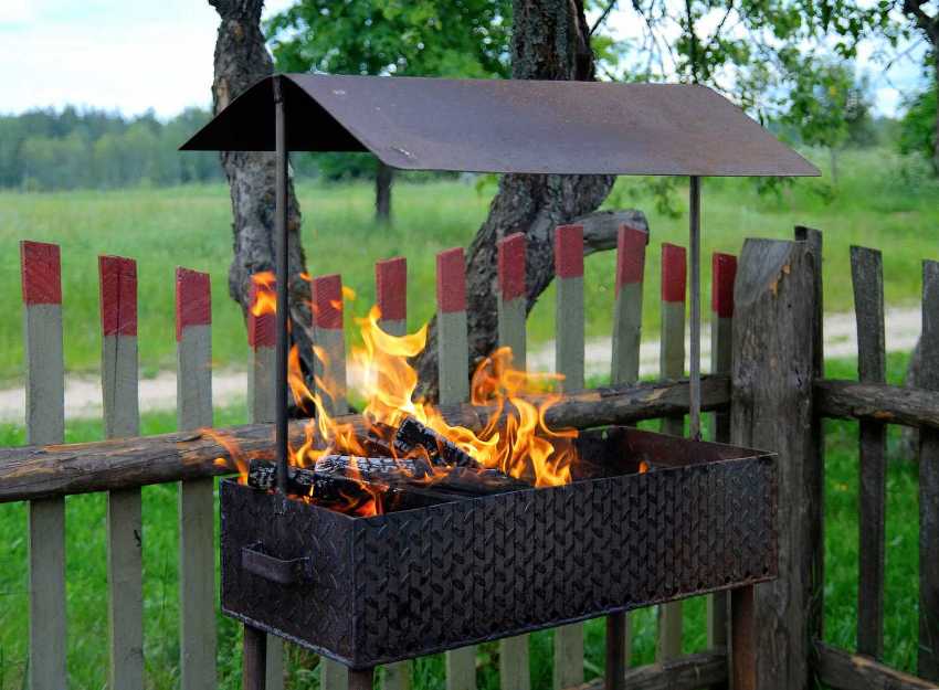 Если нет желания возиться с кирпичом или камнем, можно сварить металлический переносной мангал. По окончании дачного сезона его убирают в кладовую или оставляют на заднем дворе. В такой жаровне приготавливают мясо при любой погоде.