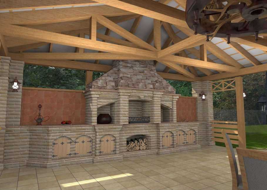 Размер навеса для барбекю напрямую связан с размером печи. Это может быть маленькое укрытие только над очагом, либо полноценная крыша с местом для отдыха.