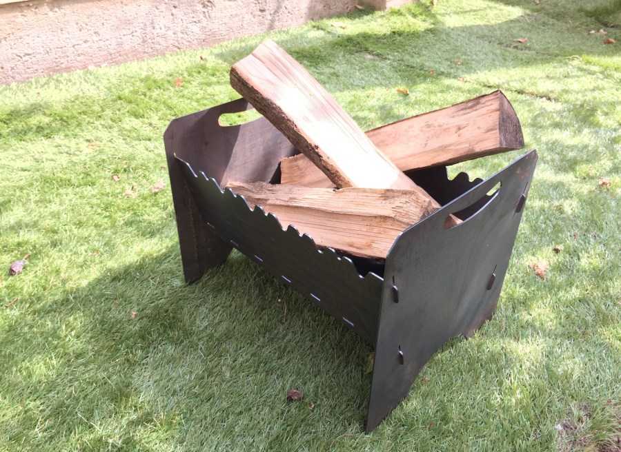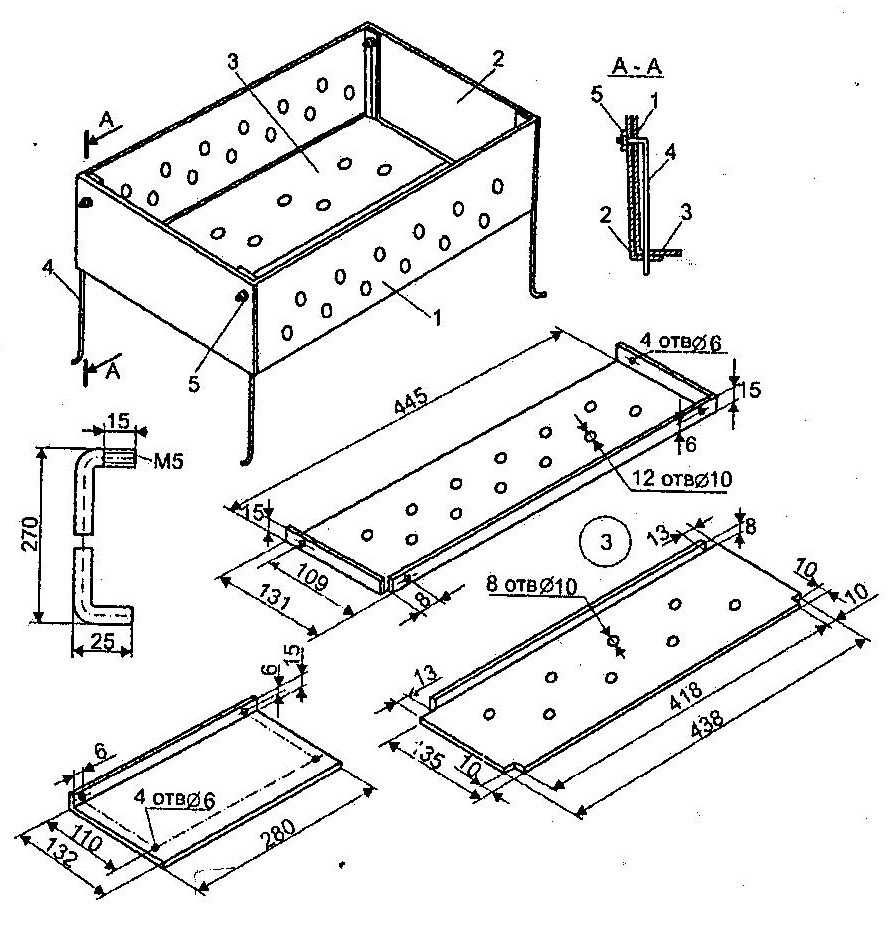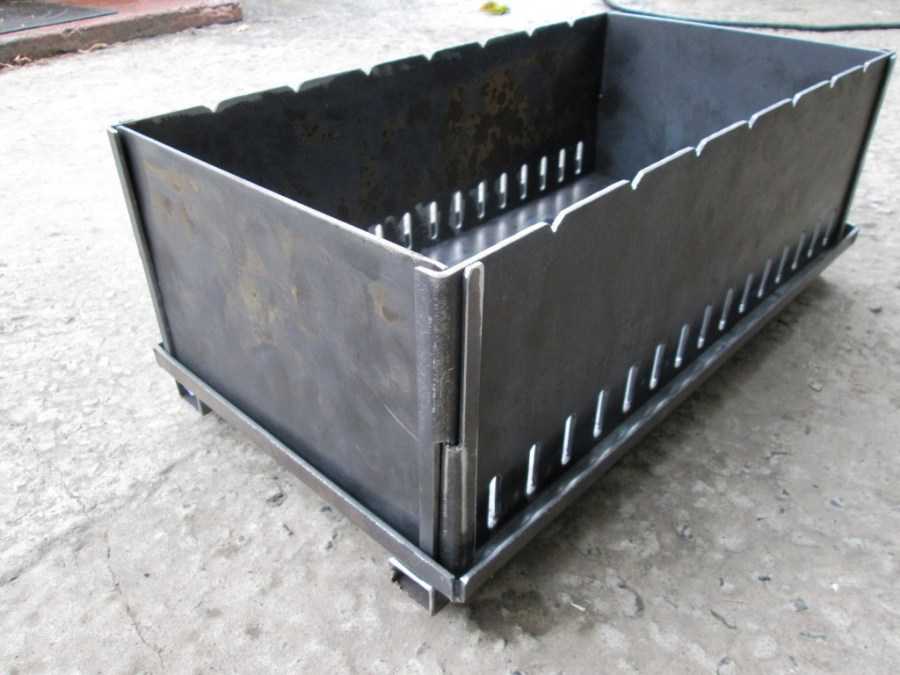 Более портативный вариант — приспособление, у которого разбирается еще и основная часть – жаровня. Ее корпус выполняется из боковых стенок и днища, соединяемых при помощи системы пазов, скоб или крепежа.