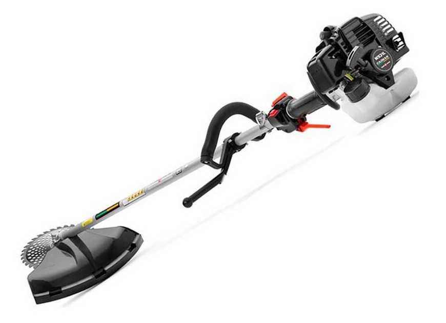 В комплектации «кусторез» идёт пильный диск-фреза диаметром 24 см с 40 зубцами или ножевая трёхлопастная система с металлическими ножами из легированной стали. Опционно – барабанная головка с двумя зажимаемыми лесками 2,4 мм.