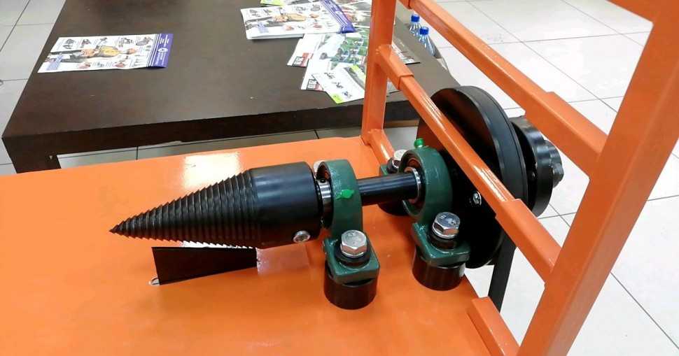 Каркас изделия имеет внушительные размеры. Это дает возможность расщеплять на станке большие бревна, крупные пеньки и бруски. Ременная передача приводит в движение конический бур, который разрывает подаваемые заготовки на части. Многие пользователи сами модернизируют агрегат. Для этого они улучшают инерцию и снижают нагрузку на двигатель. К ступице прикрепляется автомобильное колесо. Оно выполняет функцию маховика.