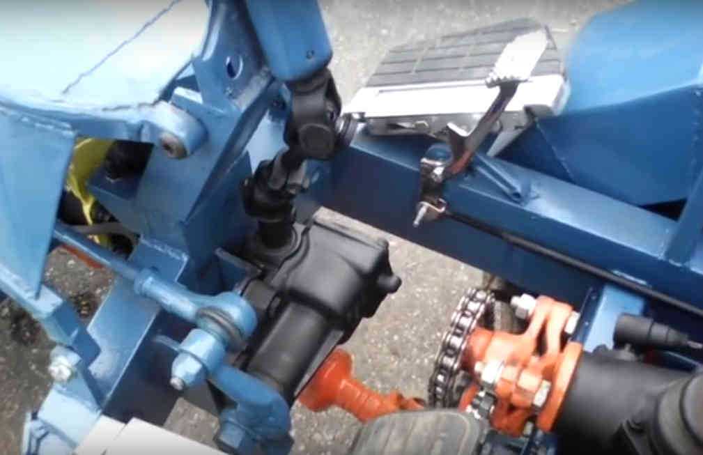 Рулевой механизм трактора так же взят от ВАЗ классики. Привод рулевой колонки сделан через кардан. Сама рулевая колонка и руль — от «Тойоты»
