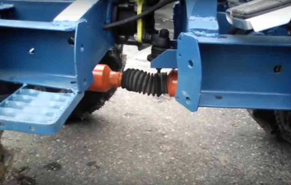 При сооружении конструкции из мотоблока переломка будет собираться несколько иначе. Создав переднюю часть конструкции, требуется оборудовать узел переломки для полноприводного минитрактора. Для этого требуется оборудовать передачу крутящего момента на заднюю колесную пару посредством карданного вала.