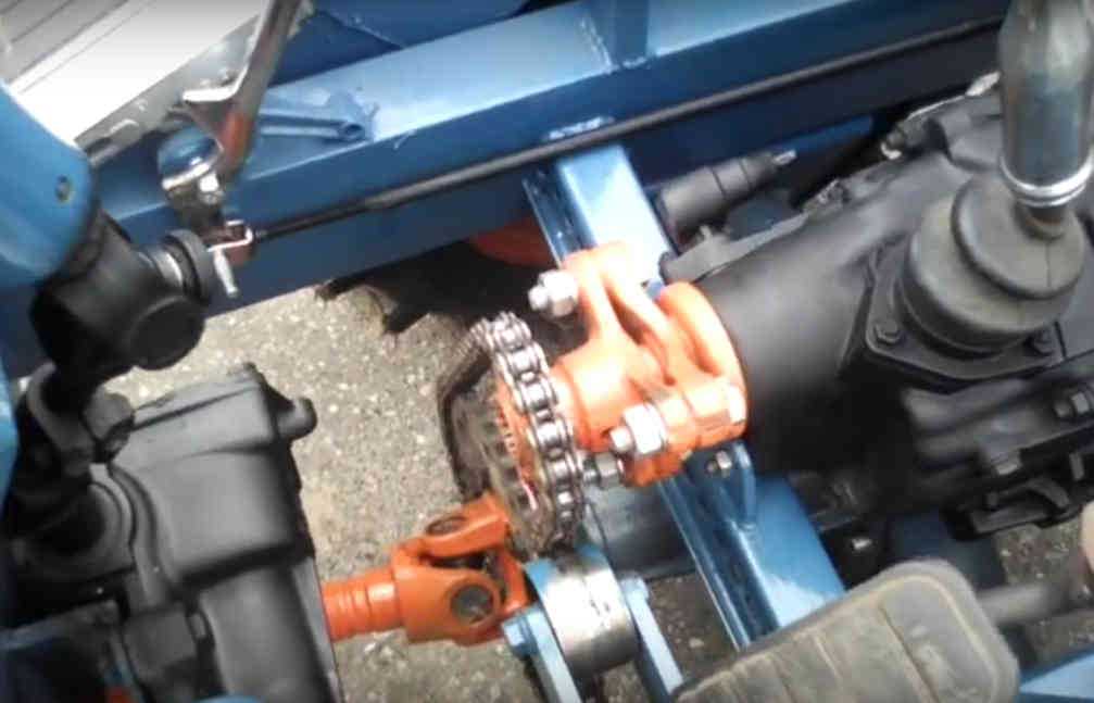 На переднем фланце моста закреплена звездочка. Передача цепная, привод от коробки, понижение в 2,2 раза. Звездочка приварена на хвостовик кардана, который прикручивается через гибкую муфту. Коробка взята от ВАЗ 2101.