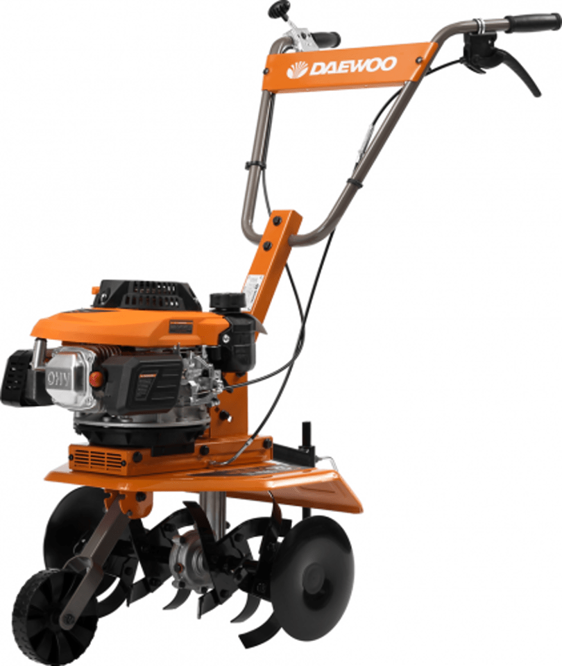 Устройство имеет регулируемое по высоте рулевое колесо и большие колеса, которые облегчают управление и переноску оборудования. Культиватор имеет стальной корпус хорошего качества. Он весит 52 кг. Максимальный диаметр резки составляет 300 мм. Культиватор Дэу имеет привод, что снижает усилия, которые необходимо приложить для его работы.
