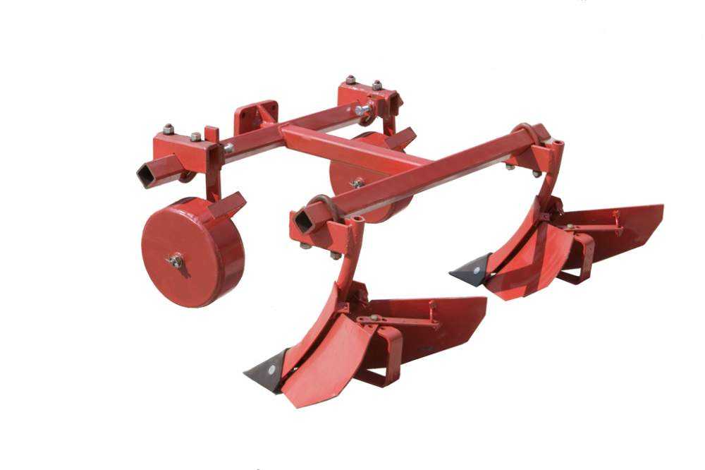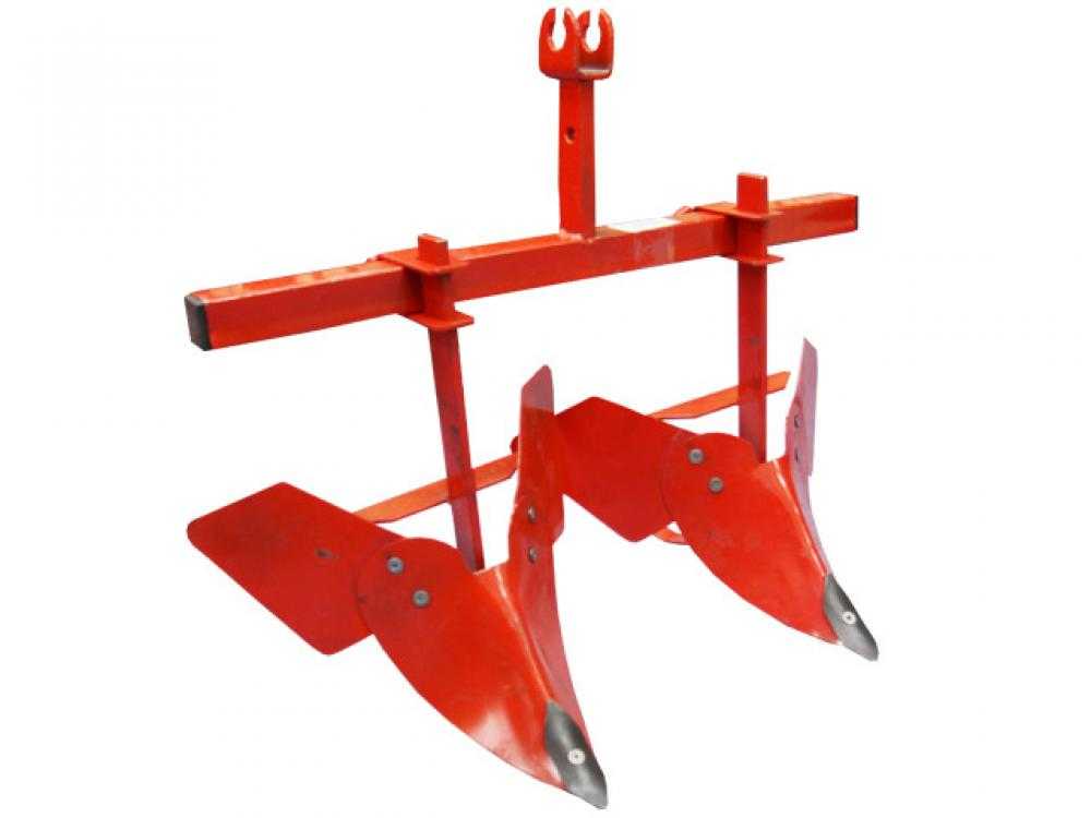 Двухсторонний плуг (окучник) применяется для окучивания сельскохозяйственных культур с уничтожением сорняков. Таким приспособлением обрабатывают почву, нарезают борозду для высаживания растений. Последующая засыпка производится включением заднего хода мотоблока. Агрегаты различают с переменной и постоянной шириной захвата.