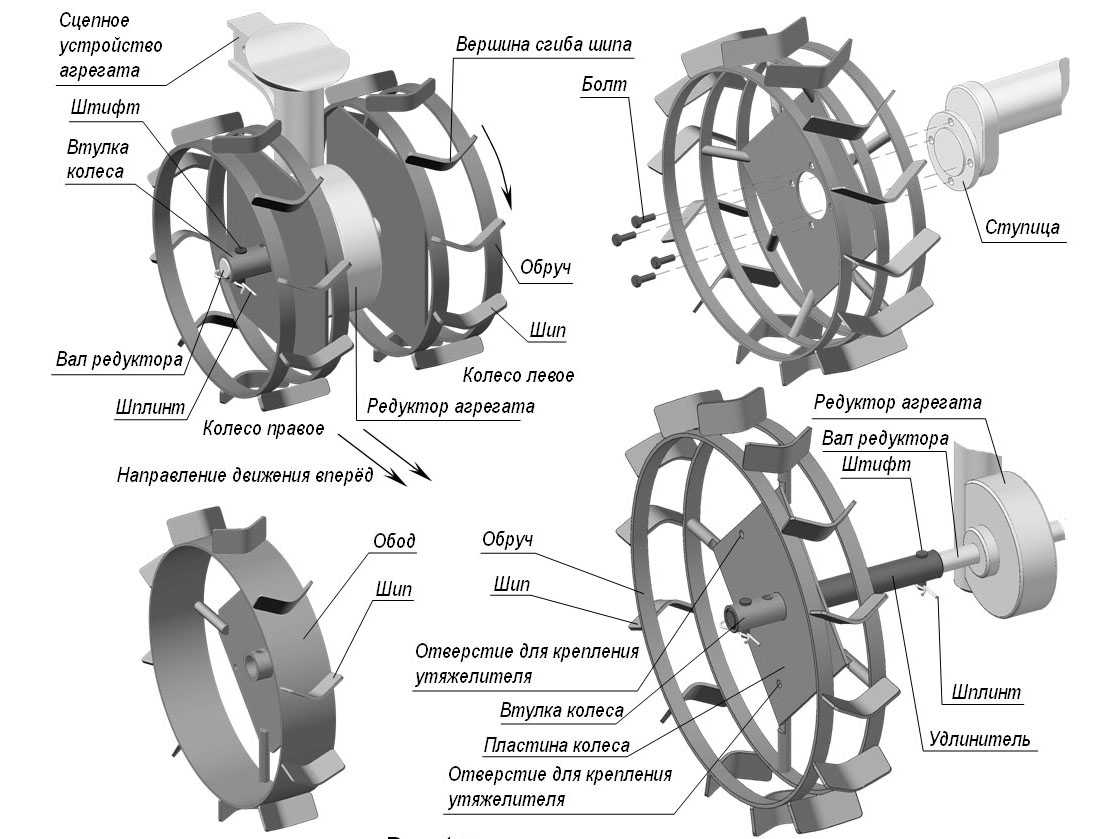 Важен размер грунтозацепных колес, потому как при маленьком диаметре не будет нужного просвета между редуктором и землей, а с узкими колесами мотоблок будет «водить» по борозде. Оптимальный размер грунтозацепных колес: диаметр — 50-60 см, ширина обода – до 20 см. вес мотоблока с колесами желателен более 70 кг. При меньшем весе мотоблок будет буксовать.
