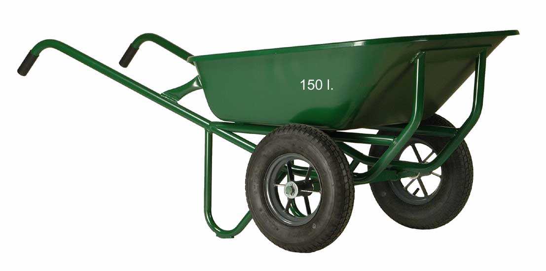 Усиленный двумя колесами экземпляр так и называется – двухколесная тачка. Колесная ось у этого перевозочного средства все равно одна, но на ней закреплены два колеса. Они способствуют таким преимуществам, как доставка более тяжелых веществ. Тележка имеет лучший баланс и устойчивость. Средство обычно более вместительно (120 кг, 200 кг). Тачку проще толкать даже при полной загруженности, она практически самоходная.