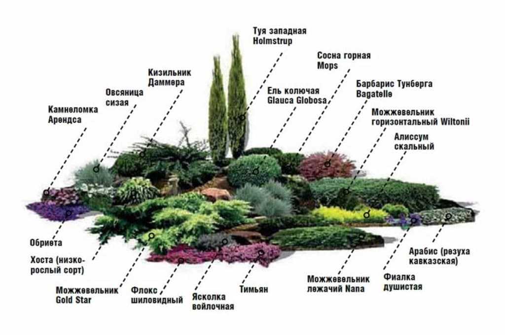 | 3 | Нижний | Подножие оформляют тенелюбивыми и влаголюбивыми культурами | Рододендроны, хвойники, камнеломки |