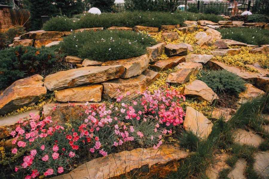Когда камни установлены, промежутки между ними заполнены землёй, пора приступить к озеленению на каменистом участке.