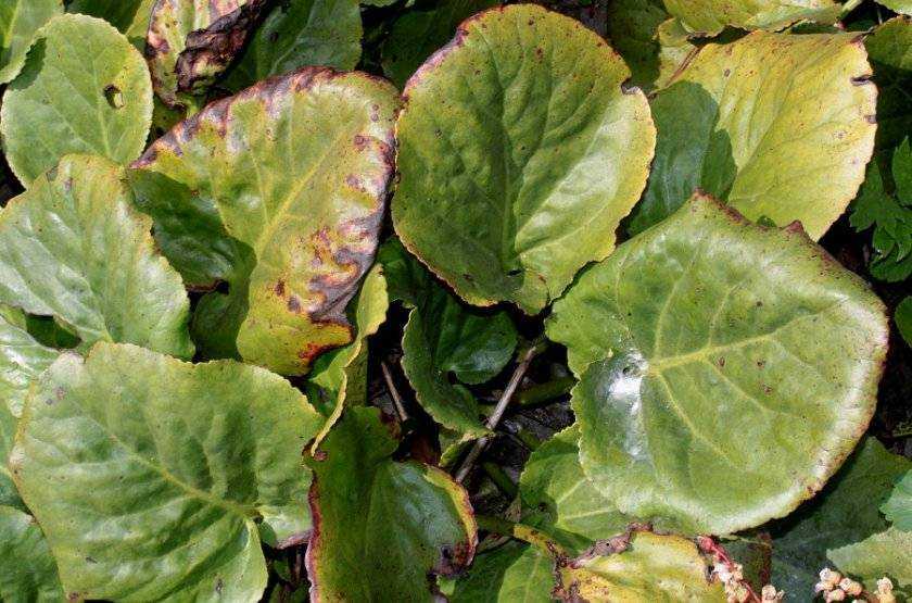 Среди садоводов бытует мнение об устойчивости бергении к заболеваниям и вредителям. Но посадка в неправильном месте, засуха или влага, наряду со слабостью перезимовавшей листвы, могут пробить брешь в природной защите, и растение становится уязвимым.