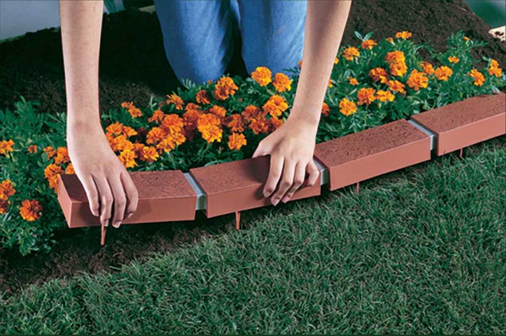 Бордюрные ленты изготавливают из пластика. Выпускаются они для удобства монтажа в рулонах. Чаще всего их используют, чтобы оформить узкие дорожки возле цветников, имеющие сложную форму. Производители садового инвентаря выпускают и секционные ленточные ограждения. Установка самая простая: конструкцию втыкают в землю.