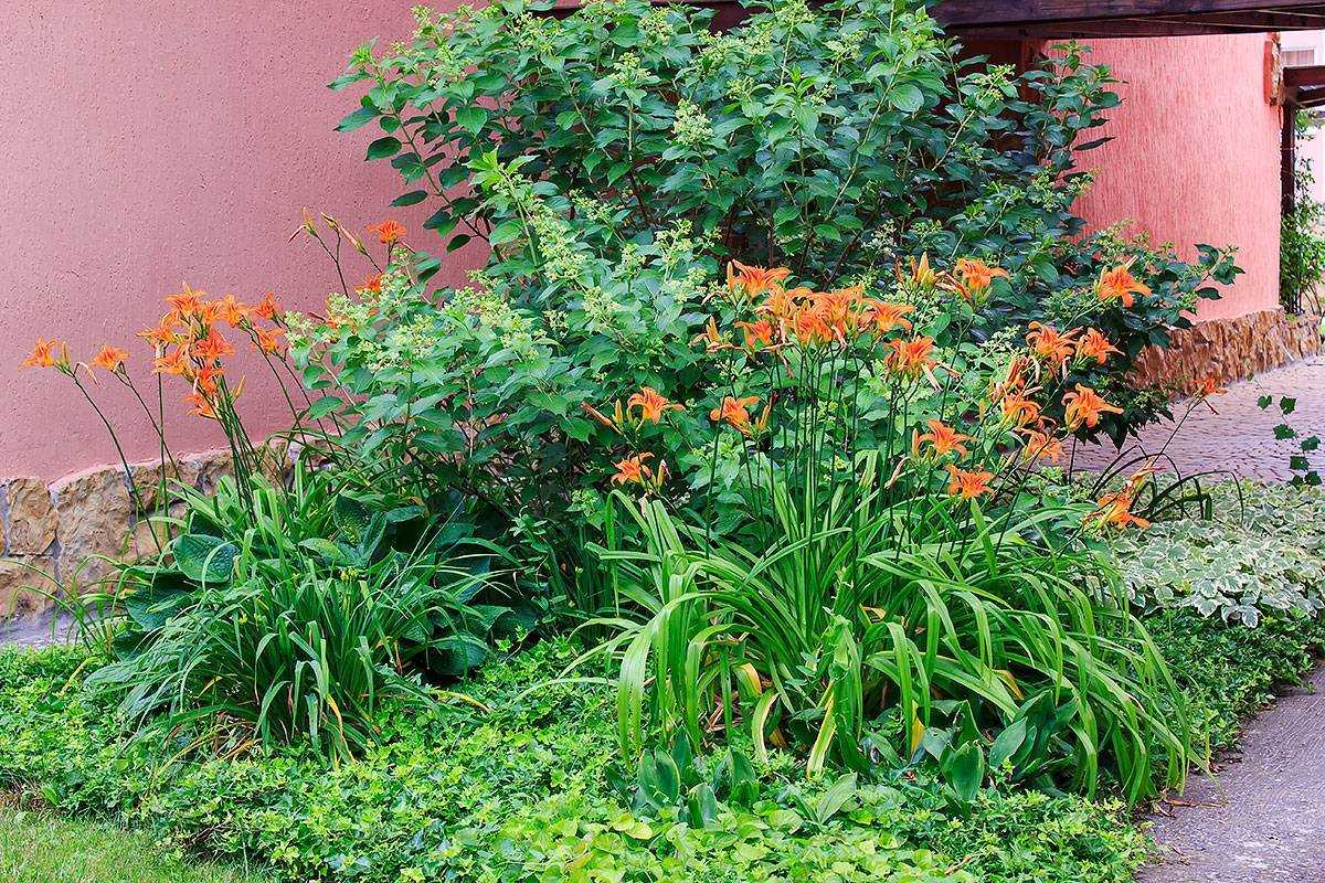 Если есть необходимость украсить уголок, где солнца почти нет, можно попробовать следующий вариант клумбы. В центре – гортензия сорта Киушу и лилейники (рыжий обыкновенный или Стела де Оро). Дальше – нарцисс поздноцветущий, хоста Зиболида, фиалка лесная, плющ и водосбор. Такая композиция всегда выглядит свежо и оригинально, практически не нуждается в уходе.