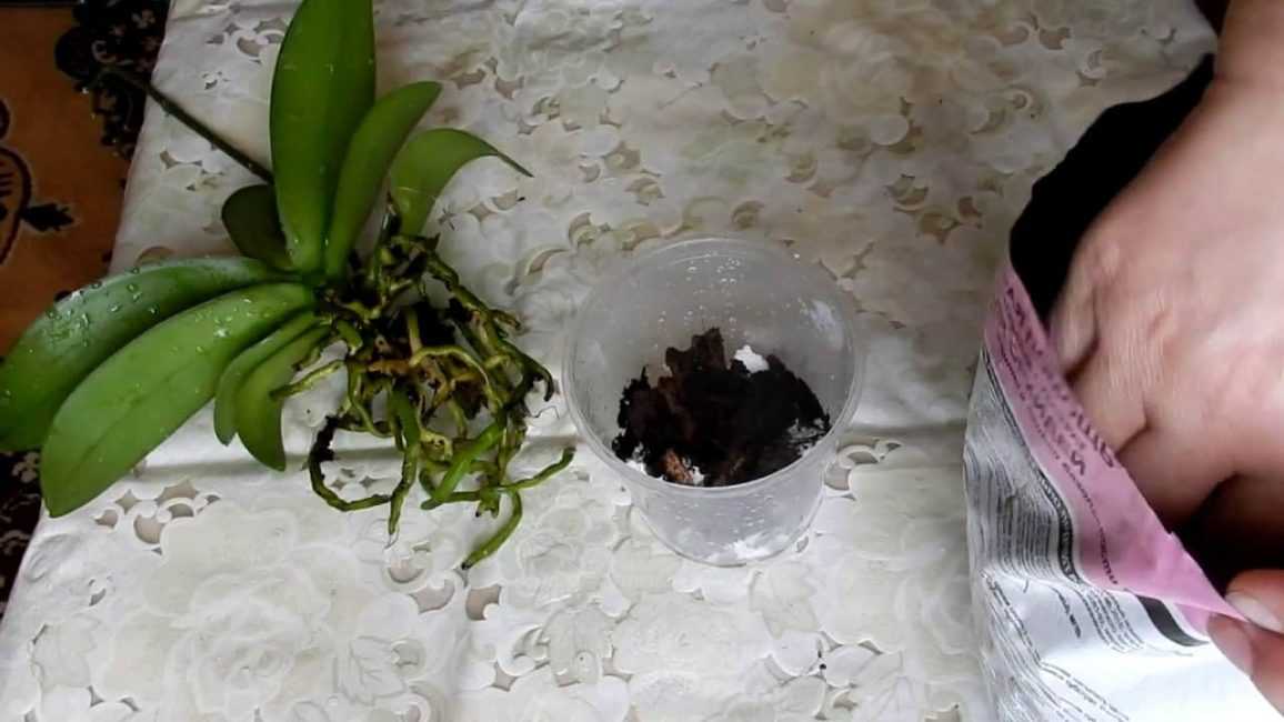 Извлечение растения из горшка. Для того чтобы безболезненно достать орхидею из горшка, нужно ее замочить в воде на 10 минут