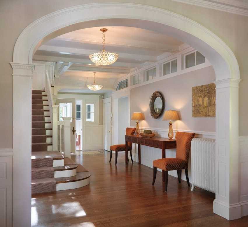 - Фрамуга – это арочная конструкция, которая представляет собой продолжение двери. Часто ее делают из тех же материалов, что и дверь, чтобы они составляли единый ансамбль. Очень интересно смотрятся подобные арки и двери со стеклянными витражными вставками. Также нередко на подобных арках размещают открытые полки, например, для книг или каких-либо мелких вещей. Практичным решением будет сделать такую арку и для входной двери. Так вы сможете сэкономить пространство, используя арку для крепления полок.