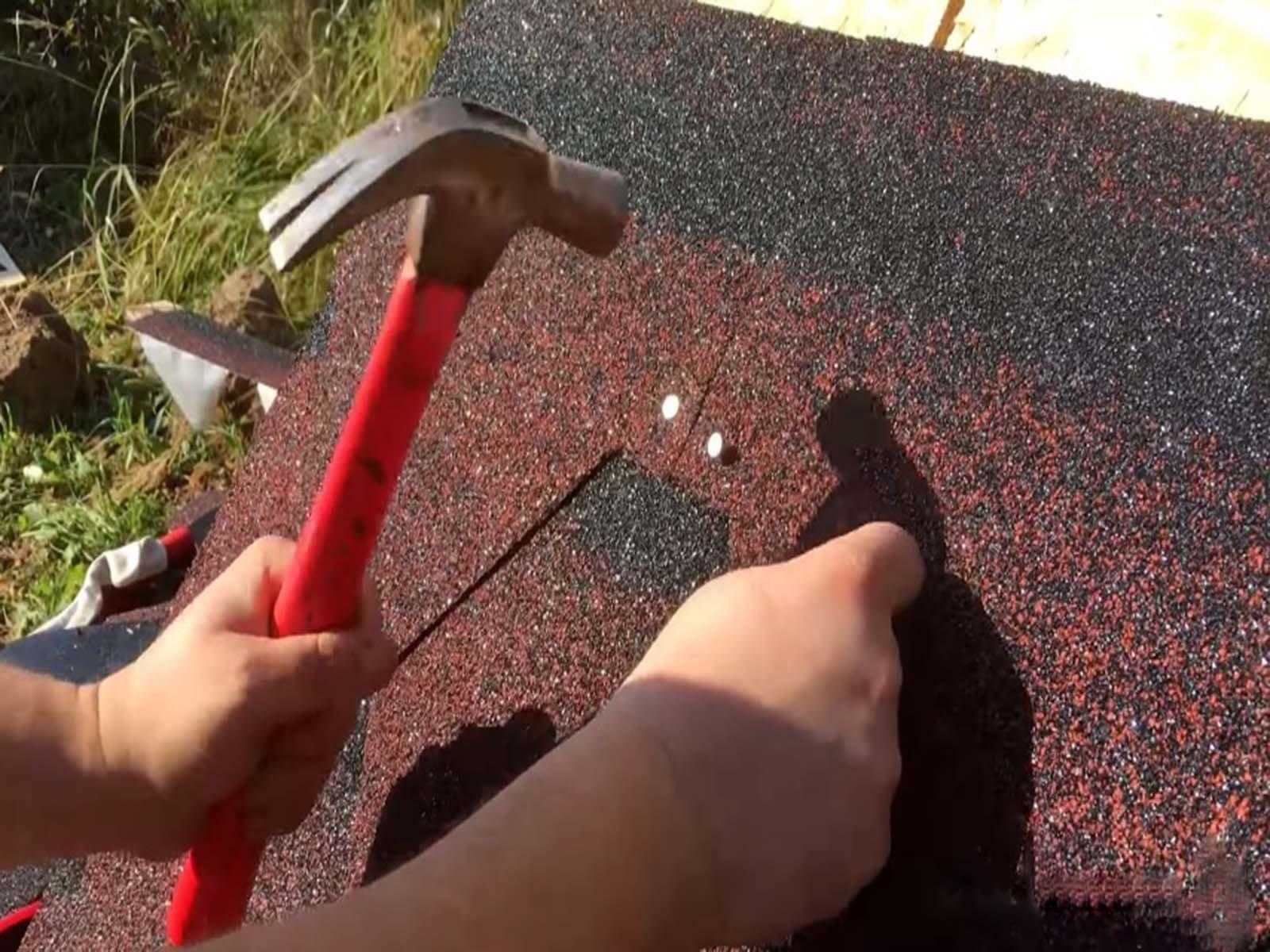 ШАГ 5: монтаж черепицы. Первый ряд битумной черепицы следует промазать мастикой и приклеить на свое место. Крепится такая черепица с помощью специальных кровельных гвоздей с широкой шляпкой. Второй и все последующие ряды стоит укладывать с нахлестом в несколько сантиметров.