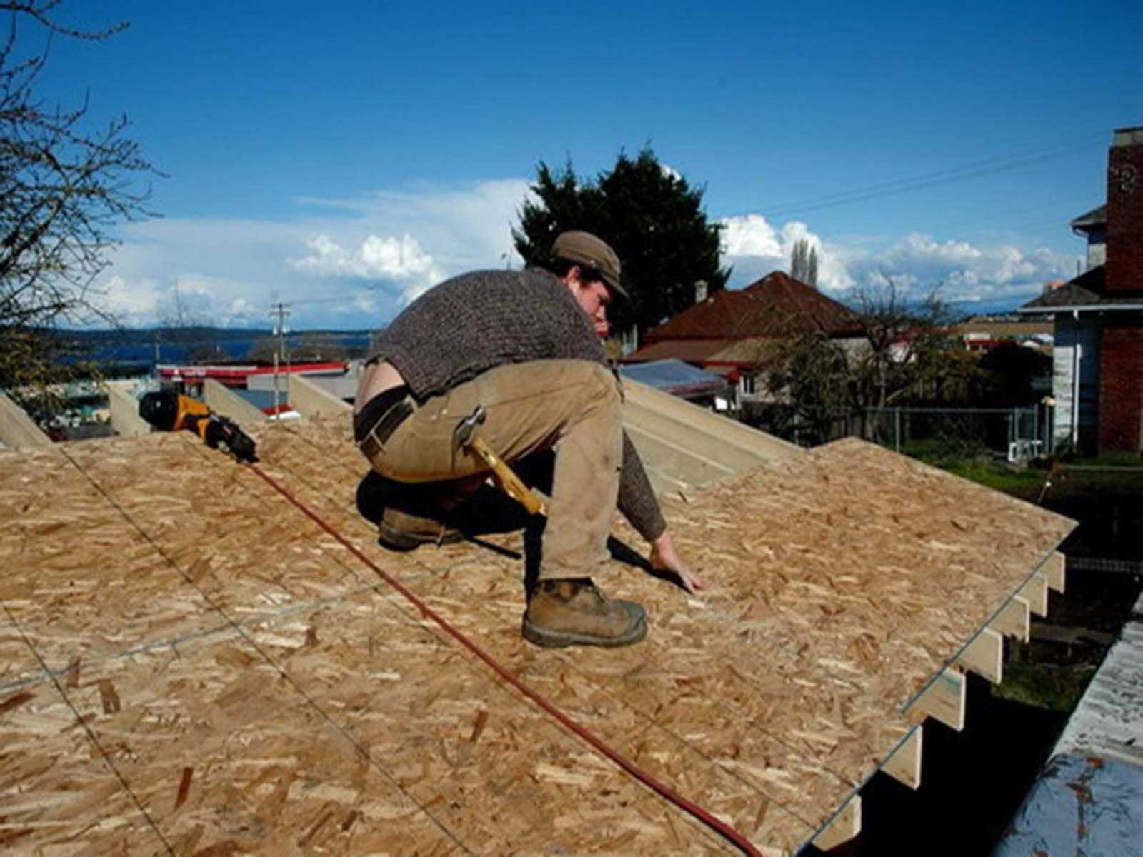 Один пласт древесины подгоняется к другому, а после прибивается строительными гвоздями. При обнаружении несоответствия размера пласта размеру балки обычно кладут дополнительную балку, а потом прикрепляют деревянный лист к ней. Необходимо сделать на крыше брезентовый настил для предотвращения попадания влаги и осадков во внутреннюю область помещения