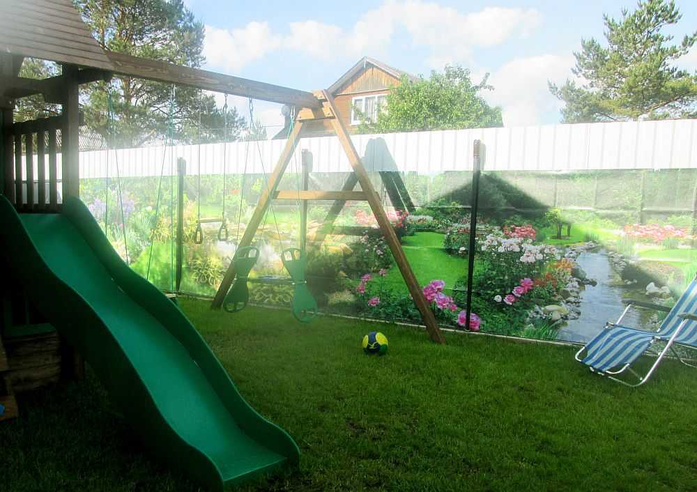 Данный материал универсален. Его можно применять не только для отделки основных секций забора, но и для ворот. Простой деревянный каркас станет оригинальной беседкой с помощью данного материала. В общем, фотосеткой можно украсить практически любую поверхность на дачном участке.