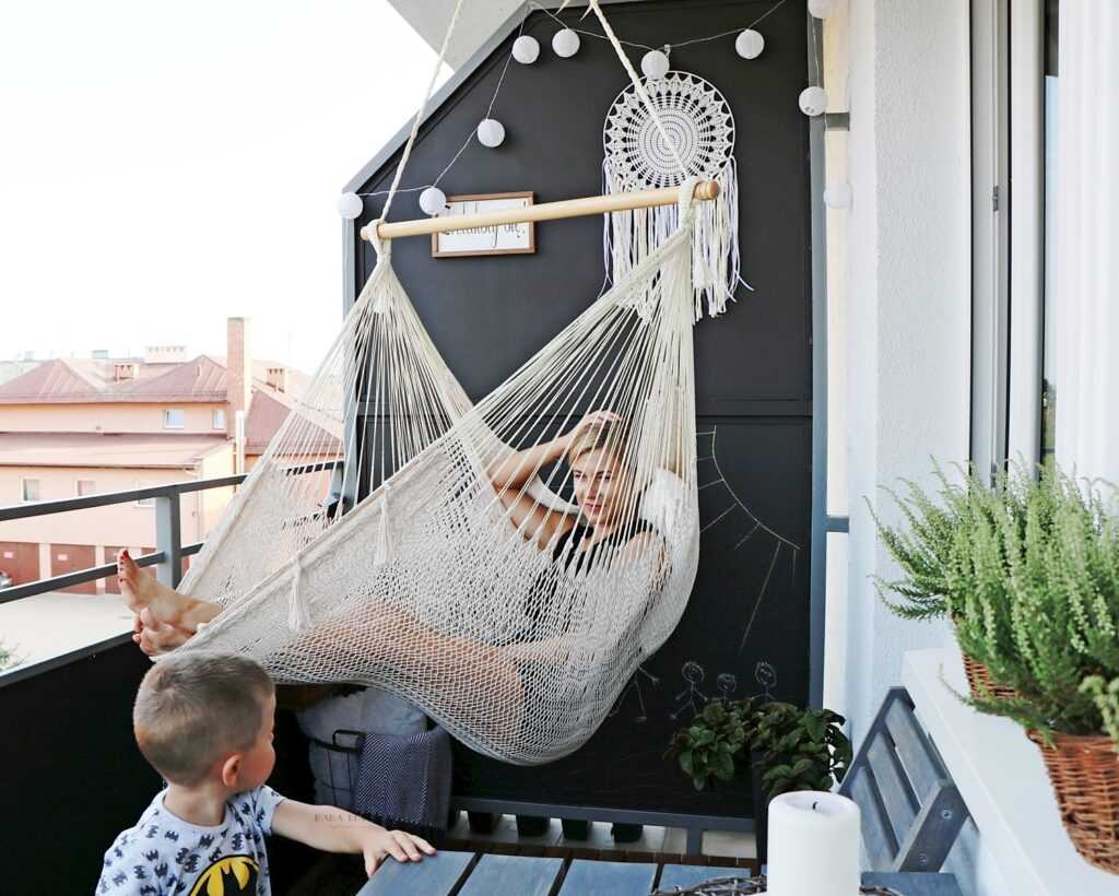 - Если хочется устроить лаунж-зону на балконе, легкое подвесное кресло станет незаменимым решением. Оно напоминает ловушку снов и выглядит очень красиво. Кресло-гамак можно установить даже на небольшом балконе. Стоит выбирать модели без ножек, овальной формы или без каркаса.