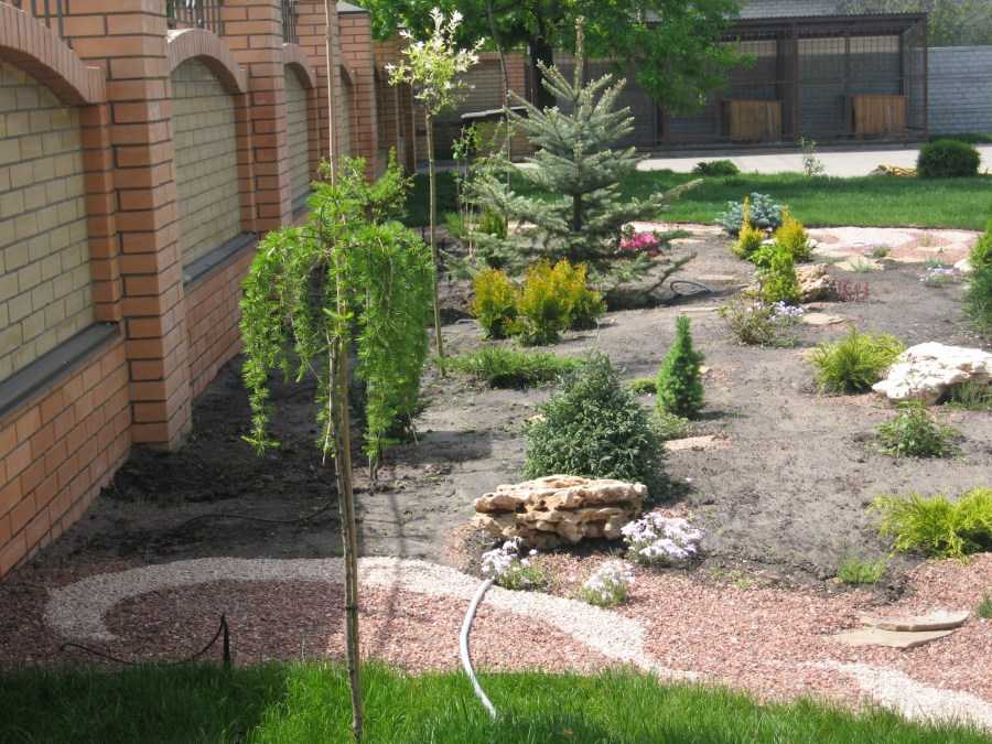 Жилой дом будет условным центром композиции, хотя точно посередине участка его располагают редко. Если рядом с забором проходит тихая улочка, то основное здание и закрытый дворик обычно обустраивают ближе к ней. Пробираться через лабиринт садовых дорожек для того, чтобы выйти на улицу, будет слишком неудобно. Совсем другая ситуация складывается с оживленной трассой. От нее лучше отгородиться и перенести строительство в дальний уголок. В противном случае шум машин и постоянные прохожие будут мешать спокойному сну и отдыху. Если участок рельефный и большая его часть находится в низине, то дом возводят на самой высокой точке склона. Такой вариант избавит от опасности подтопления. Придомовую территорию отдают под террасы, которые создадут живописную композицию. При закладке фундамента стоит учитывать тип почвы и уровень залегания сточных вод.