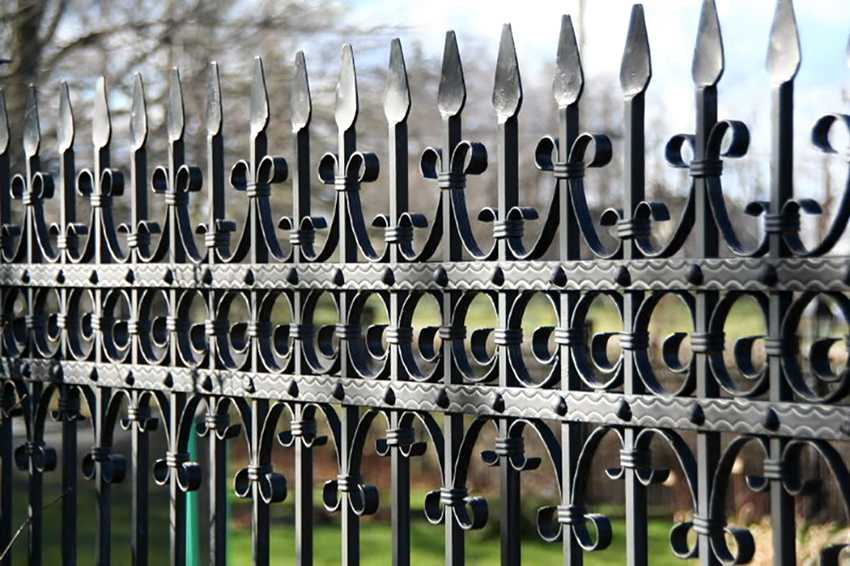 - Штампованная. Делается на производстве. Представляет собой автоматизированный процесс изготовления металлических элементов. Можно купить готовые одинаковые секции забора и установить самостоятельно. Гораздо дешевле ручной, но такая ограда не будет уникальной.