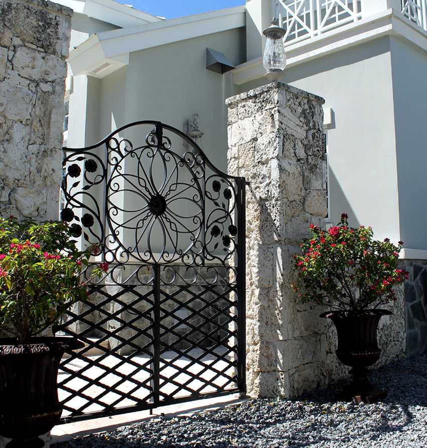 Парадный вход в прямом смысле этого слова обеспечат кованые ворота в стиле барокко или ренессанс. Они придадут торжественности любой усадьбе. Чаще всего такие кованные элементы декора, как беседки, качели, лавочки, и, конечно, ворота, выполняются в большим количеством дополнительных элементов, чаще всего спиралей и завитков.