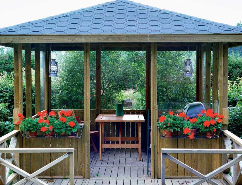 При создании беседки используйте только природные материалы: древесину и камень. В таких сооружениях приветствуются большие окна и закрытые перегородки с квадратными переплетами. На стенах можно использовать декор, который будет выступать в качестве эстетической составляющей, и поможет защитить объект от солнечных лучей.