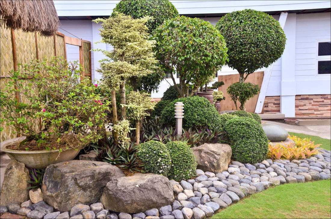 — Азиатский (восточный, японский) стиль. Дизайн в японском стиле для двора частного дома обычно изобилует маленькими террасами вокруг дома, их здесь несколько разных форм и размеров. Также популярны многоуровневые террасы вокруг декоративного водоема с рыбками, а растения принято выбирать декоративнолиственные, а не цветущие. Азиатский стиль лучше всего смотрится при минималистичных или современных домах.