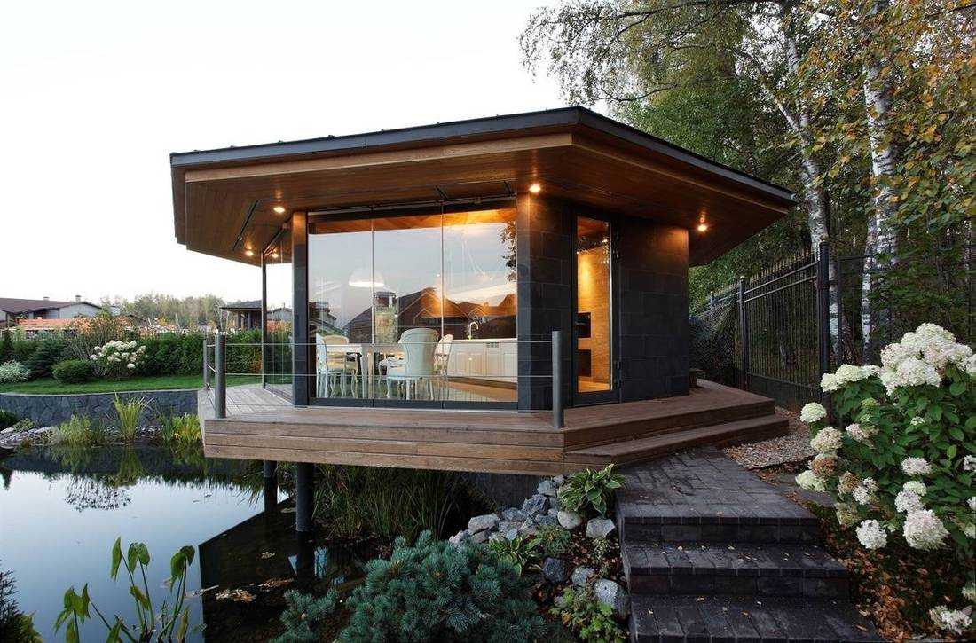 - Беседка располагается непосредственно на берегу пруда, где ее окружают различные растения. Как вариант – это применение вьющихся растений, которые затем послужат, как укромный уголок для отдыха.