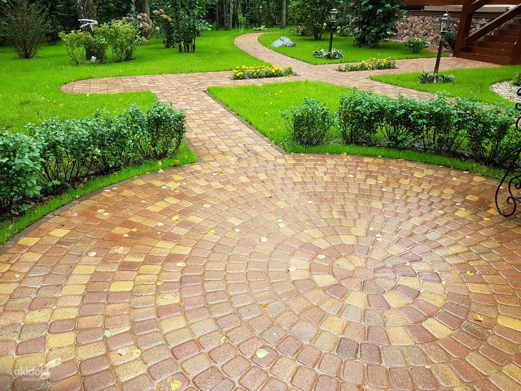 Чаще всего применяется сплошное мощение, когда тротуарной плиткой выкладывается большая часть территории двора. От мощения в разных направлениях прокладываются дорожки, помогающие добраться до различных зон: сад, вспомогательные постройки, душ, баня и прочее.