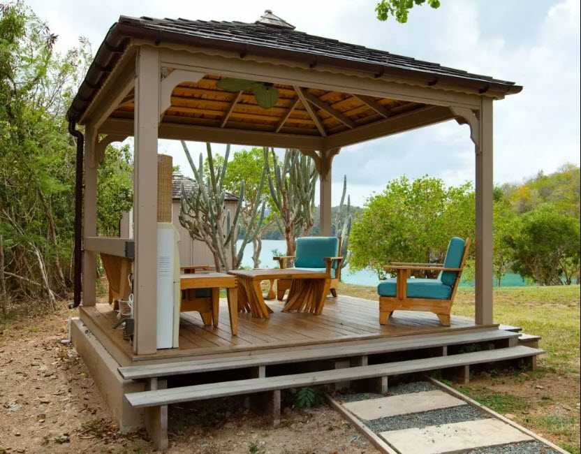 Самый простой и популярный вариант – открытая конструкция, не имеющая ограждений. Беседка состоит из пола, вертикальных опор и крыши, что обеспечивает максимум свободного пространства. Что касается габаритов беседки, то все зависит от предпочтений домовладельца, кому-то достаточно маленькой постройки для двоих, другим нужна масштабная постройка для того, чтобы собрать семью за одним столом. Главная задача такой беседки – дать отдохнуть в тишине, насладившись природой, ее красотой и величием.