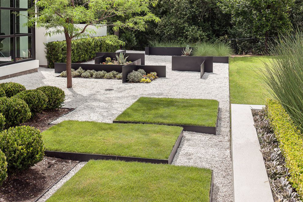 Оригинально смотрится сочетание камня и мульчи с четкими границами. Создав такую волнистую линию, легко придать участку интересный вид. Необходимо высадить качественный газон яркого цвета. Вместо гравия дорожки иногда выкладывают плиткой с травяными врезками. Это выглядит стильно и современно.