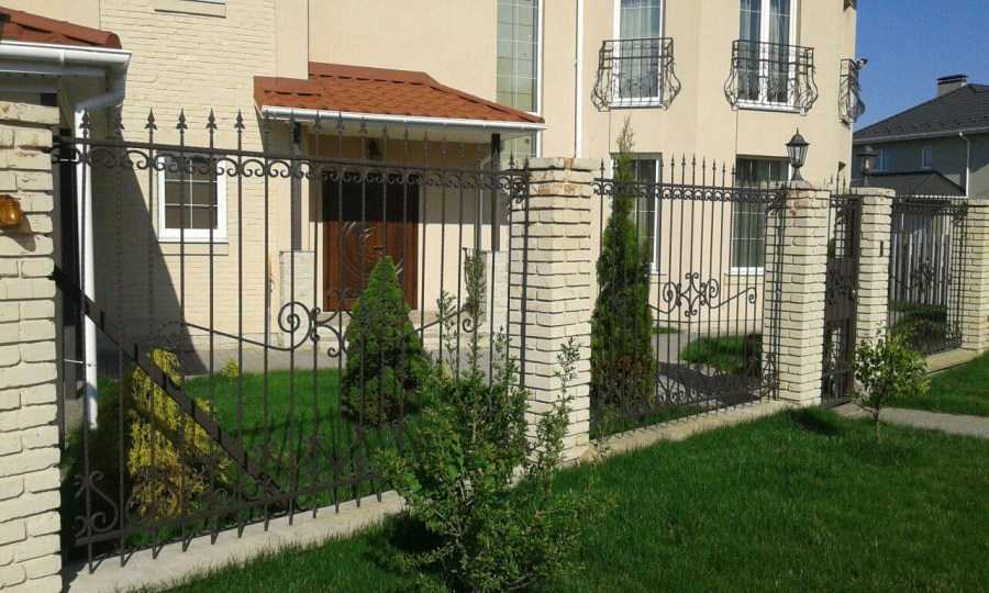 Кованый забор черного цвета с фундаментом и столбами из кирпича