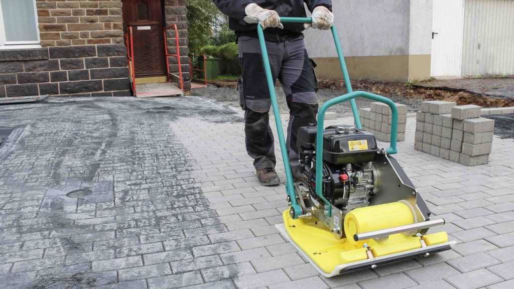 - Та же операция, проводимая с основанием под плитку и с целиком уложенным участком тротуара посредством вибрационных механизмов.