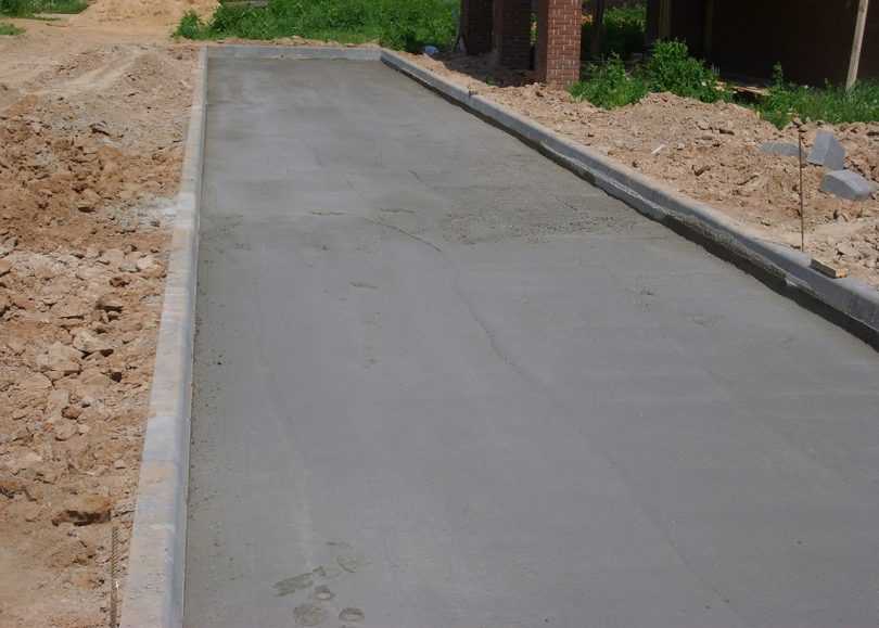 Заливку бетона выполняют не ранее чем через сутки после фиксации бордюров. Перерыв можно использовать для устройства армирования (дорожки, на которые не будет заезжать автотранспорт и тяжёлая техника, можно не армировать). Толщина бетона принимается раной 15-ти см при отсутствии армирования и 20 см при наличии арматуры. При наличии подвижных пучинистых грунтов толщина может увеличиваться до 40 см.