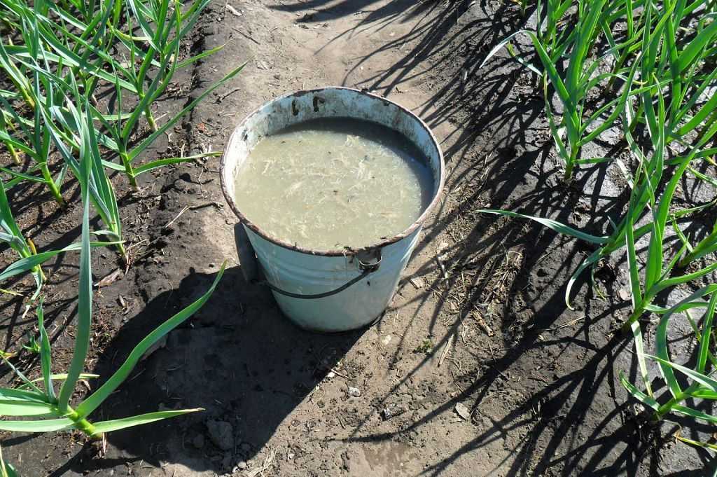 Перепревший навоз или готовый перегной добавляют между рядами чеснока слоем в 3 или 5 сантиметров. При поливе удобрение заделывается в почву, отдавая все полезные вещества растениям.