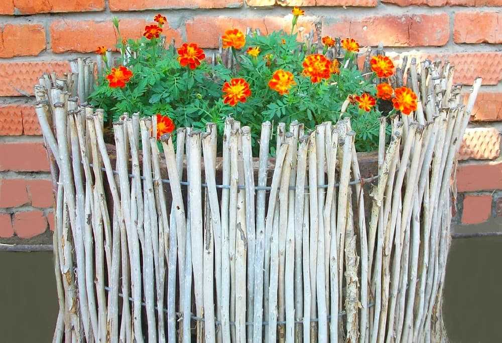 Деревянные прутья и ветки деревьев в качестве декоративной ограды