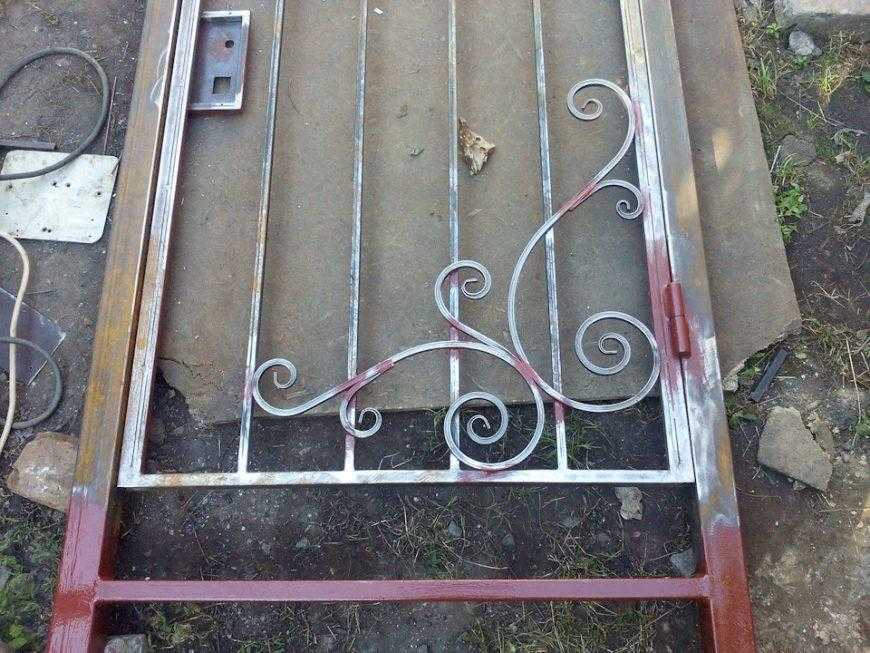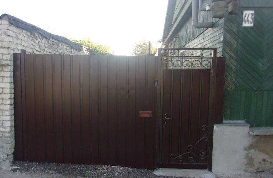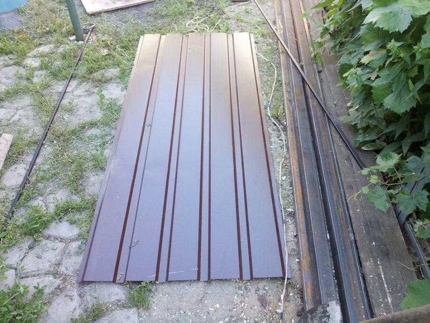 - Отрезается лист профнастила, примеряется к каркасу, проверяется, чтобы калитка хорошо открывалась. Если все хорошо, хорошенько прикручивается на саморезы.