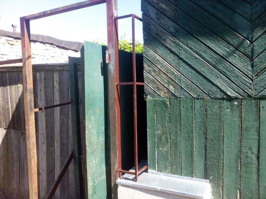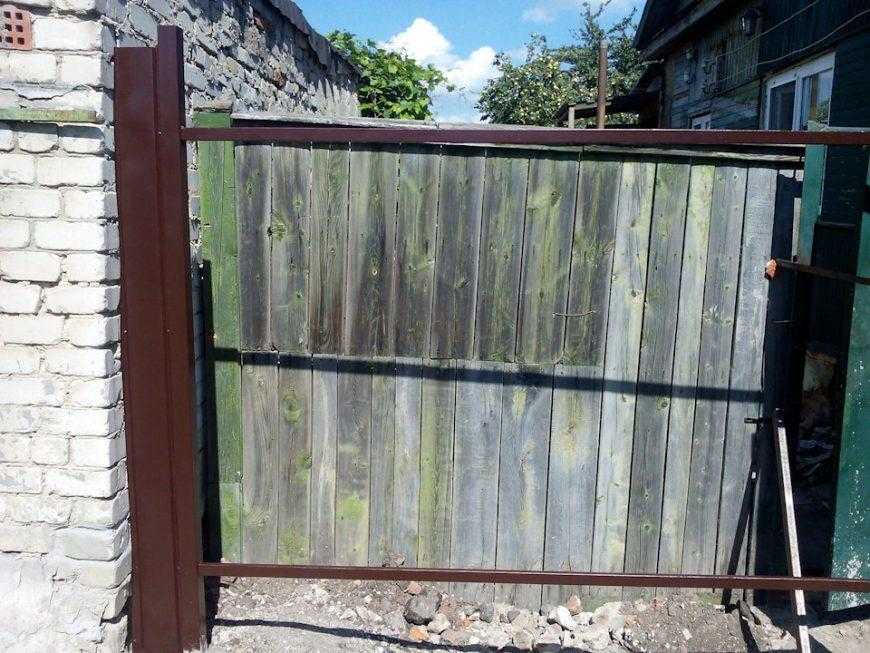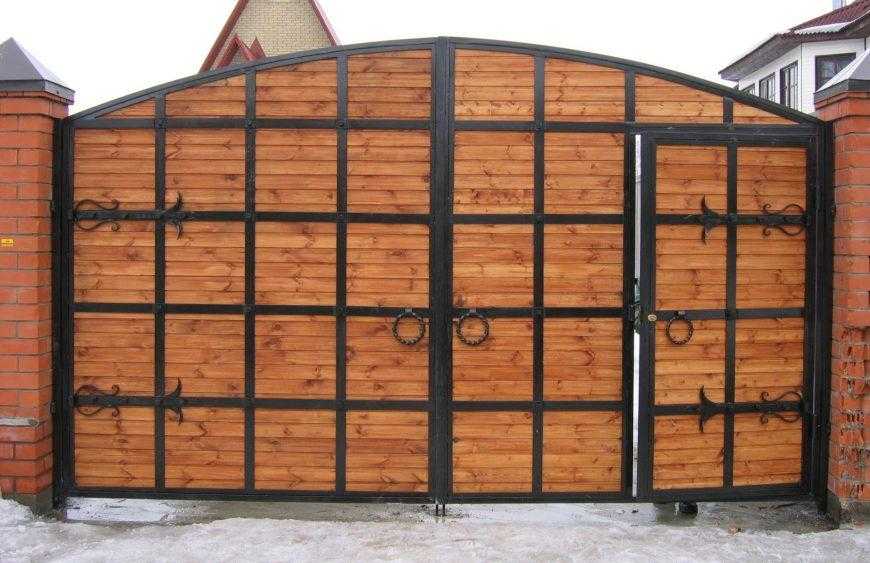 - Очень часто можно встретить комбинированный вариант — стальные опоры с металлическими створками, обшитые деревянными досками, которые также служат и дополнительным элементом прочности.