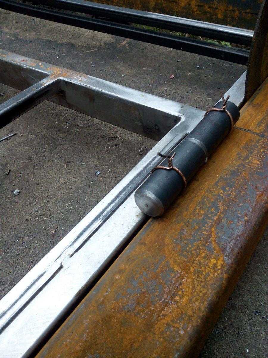 - В нижней части рамы приваривают металлические трубки небольшой длины. В них будут вставляться штыри, выполняющие функцию запоров.