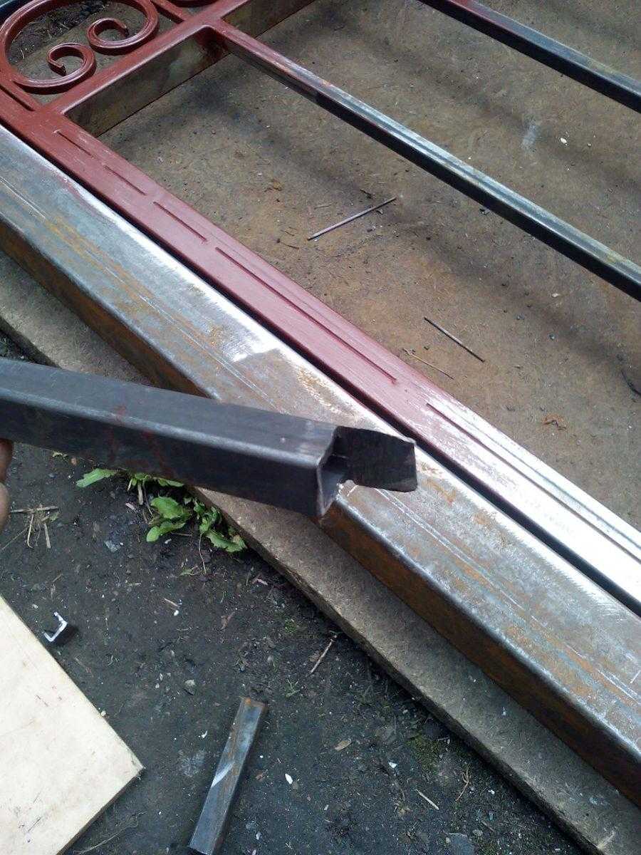 - Делается усиление калитки: берутся металлические трубы, прикладываются к каркасу, на них с помощью мела отмечаются места срезов, далее с помощью болгарки готовятся нужные элементы и привариваются.