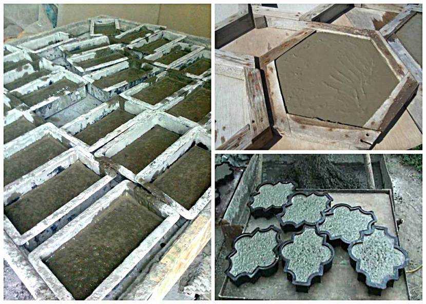 Изготовление бетонных плиток начинается с заливки бетонного раствора в половину высоты опалубки. Заложенный раствор надо обязательно уплотнить. Идеально, если в процессе изготовления используется вибростол. Но если такового нет, то мастерком проштыковывают заложенную смесь, что бы удалить из нее воздух, который попадает в бетон во время его замеса. Воздушные поры и раковины снижают прочность бетонного изделия.