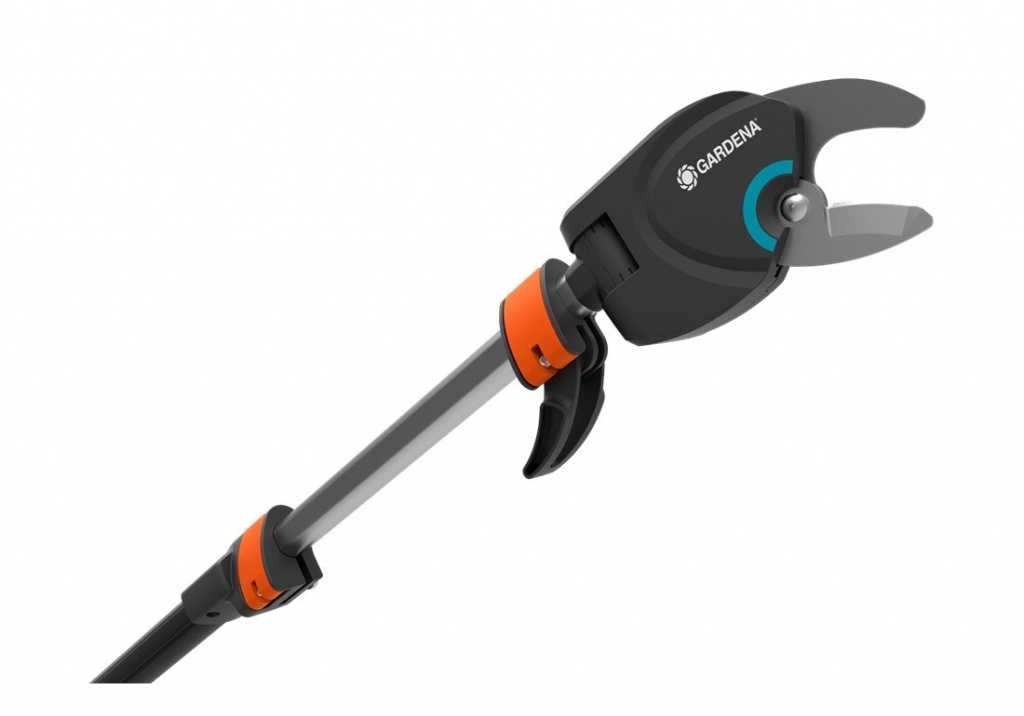 Режущий механизм может поворачиваться на 90° и фиксироваться в семи наиболее удобных положениях. Телескопическая штанга выдвигается до 2,8 м.
