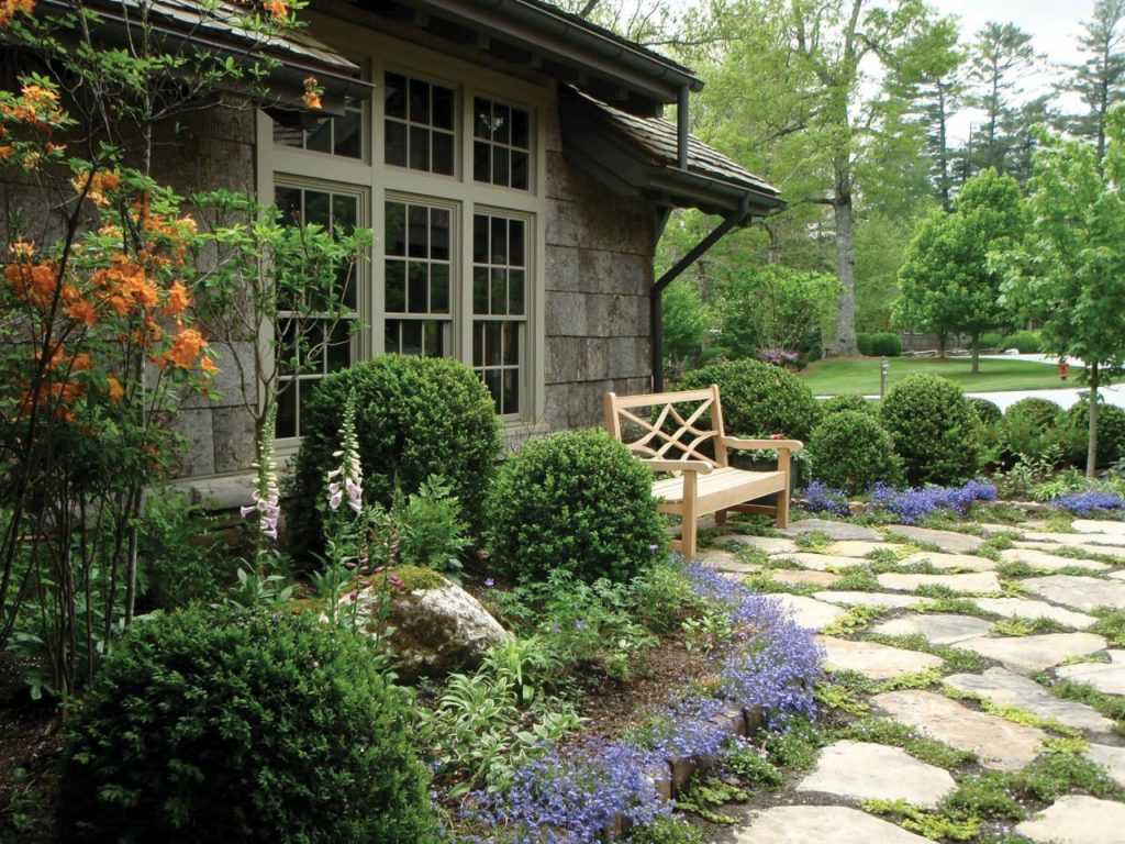 Под окнами рекомендуется высаживать ароматные цветы, такие как розы, фиалки, астры. Прекрасно смотрится композиция из мальв и дельфиниума, если расположить её вдоль дорожки к дому. В непосредственной близости к жилищу можно разместить садовые скульптуры: мраморные статуи и глиняные фигуры.