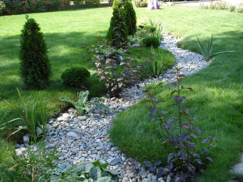 Более простой вариант – это сухой ручей, где вода отсутствует. Это своего рода стилизованный элемент ландшафта, который всего лишь имитирует бегущую воду. А теперь давайте подробней рассмотрим каждый вариант.