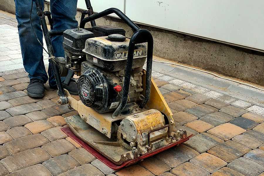 Полезное замечание! Перед трамбовкой плитки ее следует очистить от мелких крошек и остатков щебня (иначе можно повредить демпфер электроплиты и поверхность покрытия).